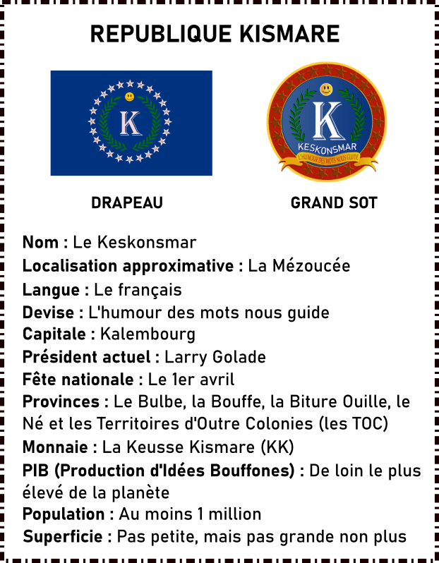 Situé dans la Mézoucée, une région du monde aisément introuvable, le Keskonsmar est un pays de Cocagne cocasse, complètement patrie en sucette.