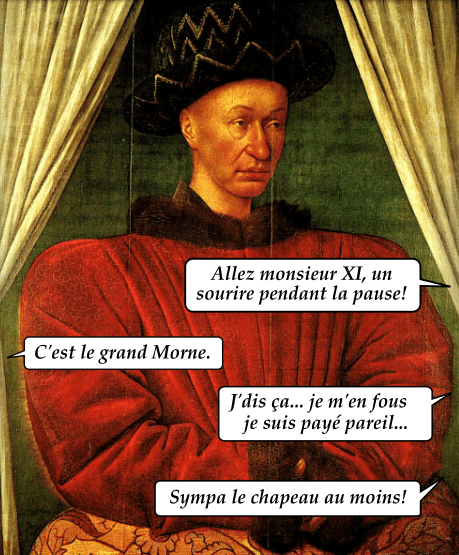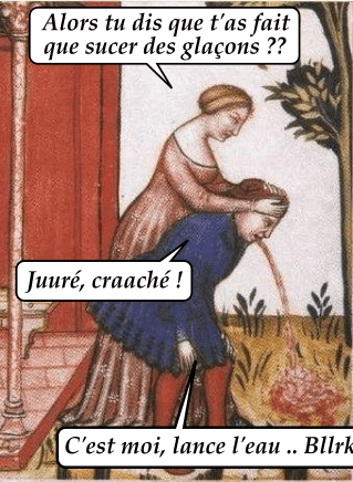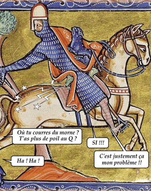 Là-dessus, Luc saisit le barbant par la cubitière, lui flanqua une bonne poignée de poil à gratter dans le froc, puis claqua le postérieur de son cheval qui s’enfuit au triple galop. Quelle torture d’avoir le cul qui gratte sans pouvoir se permettre d’avoir le doigt qui pue. Sinistre XI passa sans s’arrêter devant le gros de ses troupes, qui éclata de rire. Le Maussade avait perdu la guerre militairement et spirituellement. Son échec était total. On entendit plus jamais parler de lui. La légende dit qu’il galope toujours en serrant les fesses pour ne pas tomber.