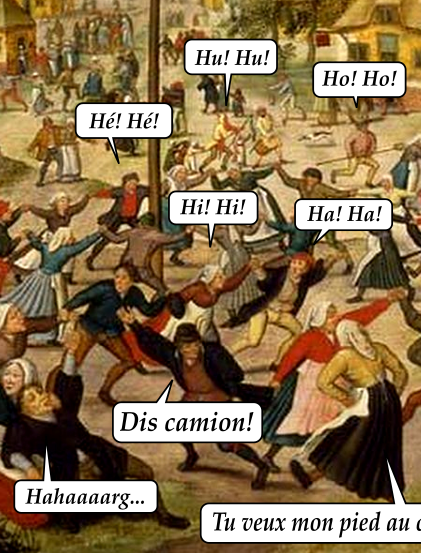 Les paysans avaient retrouvé la patate. Les fruiticulteurs s’étaient refait la cerise. Ils ramenaient désormais leur fraise pour secouer les moines trapus comme des pruniers et leur distribuer des pêches. En pleine poire, plus d’un finit dans les pommes. La réponse des bergers fut de prendre les barbants pour des jambons en leur faisant croire qu’ils étaient devenus copains comme cochons. Ils les invitaient aussi à manger, non pour leur donner de la confiture mais en les considérant bêtes à manger du foin.