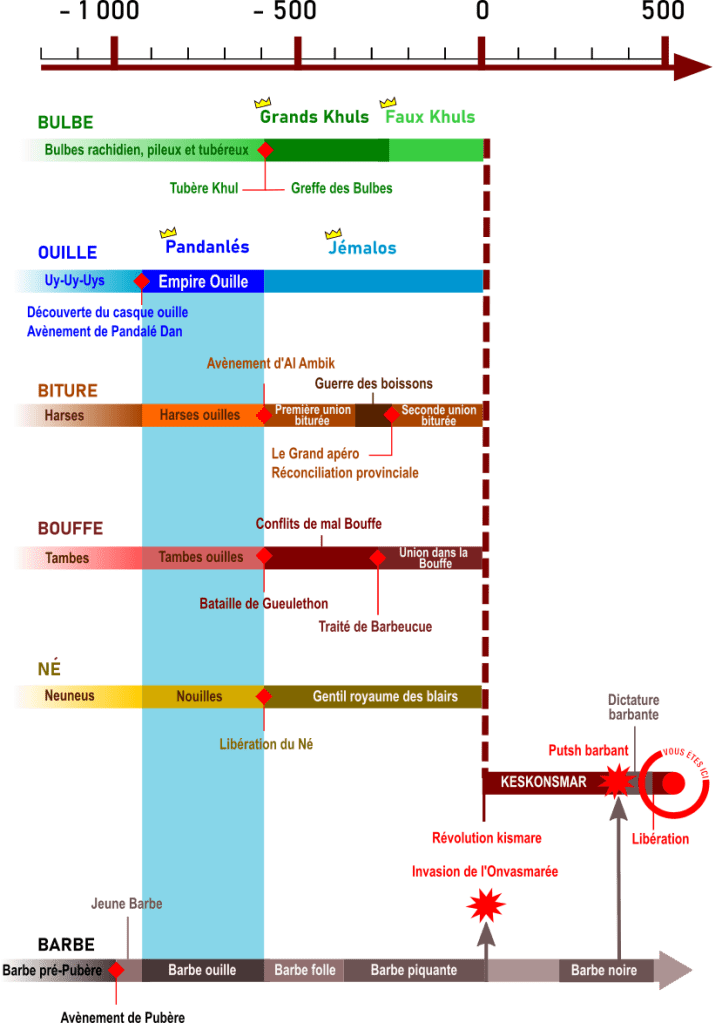 Comme les kismars ne font décidément rien comme tout le monde, ils suivent aussi leur propre calendrier. Il pose l’an 0 à l’irruption volcanique du Piton Monthy. C’était pour vous, les grégoriens, il y a un peu plus de 500 ans. La frise suivante présente les principaux faits historiques kismars. La Barbe ne fait pas partie du pays mais s’est cependant trop mêlée à l’Histoire kismare (en frisant le ridicule) pour s’en retrouver absente.