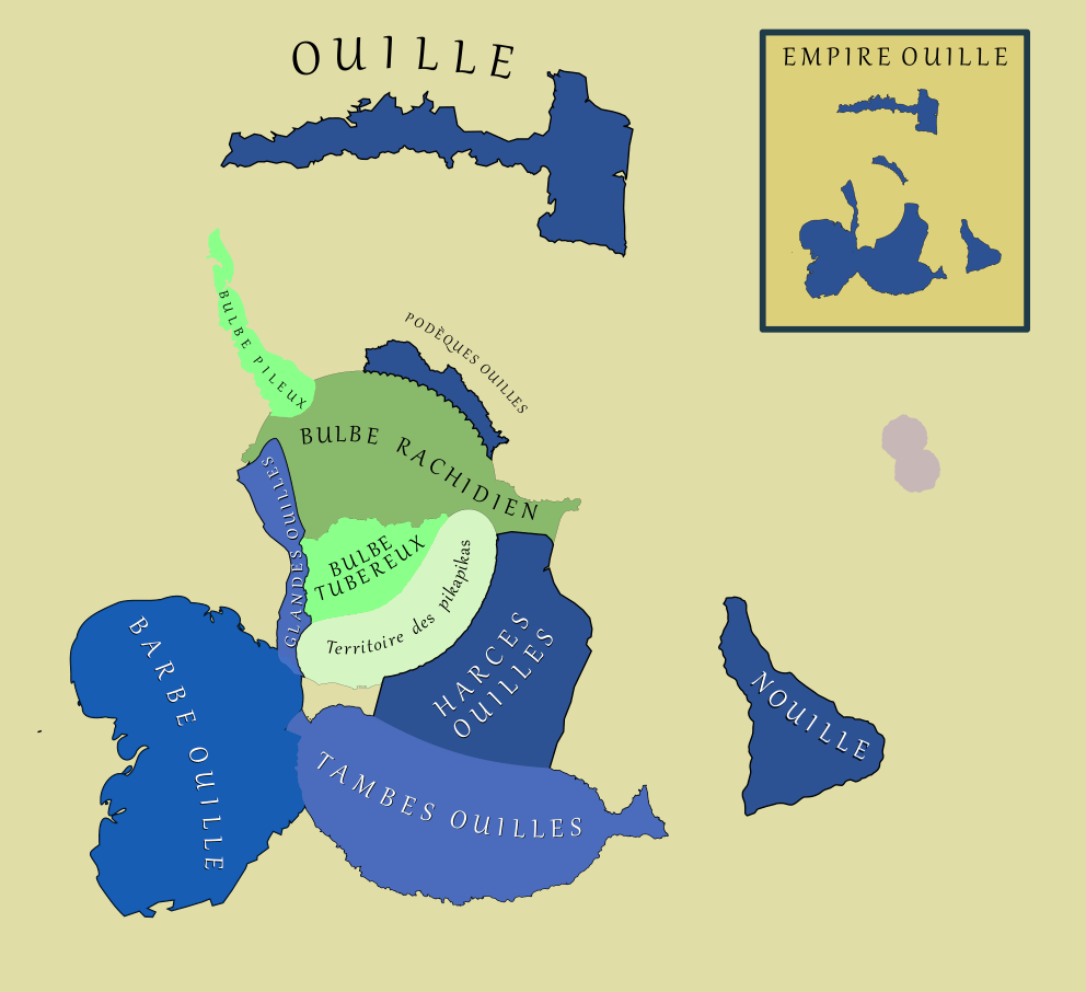 Remarquer que les deux derniers souverains étaient adeptes de techniques de combat similaires. Sous l’ère Pandanlée, l’Empire Ouille s’étendrait progressivement jusqu’à connaître son apogée en plein Pandanlé-Bùl. Il englobait alors les province actuelles de la Barbe, de la Bouffe, de Né et de la Biture, ainsi que la parties littorale du Bulbe qui borde le golfe Jétéhi. Ces provinces furent rebaptisées (autrement dit ouillisées) : les Glandes en Glandes Ouilles, la Barbe en Barbe Ouille, les Tambes en Tambes Ouilles, la Harce en Harse Ouille, le Né en Nouille. Suite à un malencontreux malentendu, le K de kodèque devint un P, les colonisés auraient dû s’appeler les kodèques ouilles.