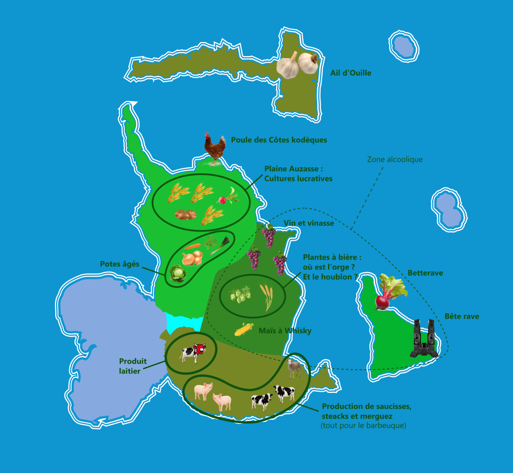 Toujours dans la Bouffe les steaks et les entrecôtes son préparés le long des Côtes d’Eubeuf. Les cochons filent mignons dans la région des Côtes d’Euport. Enfin les moutons finissent en saucisse du côté de la Mer Guèze.